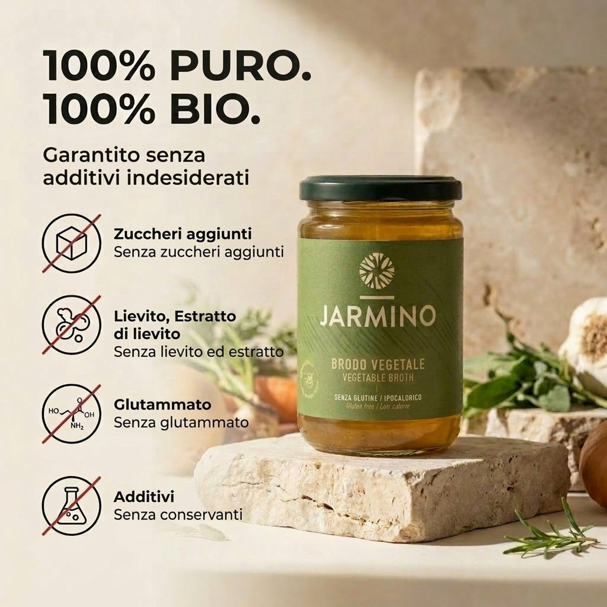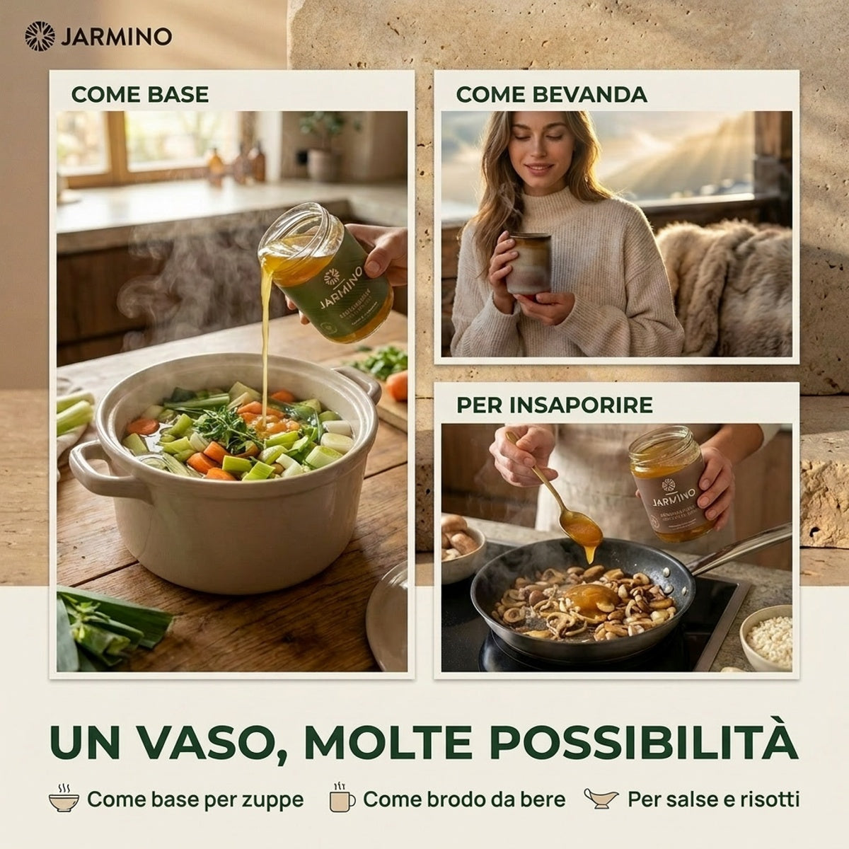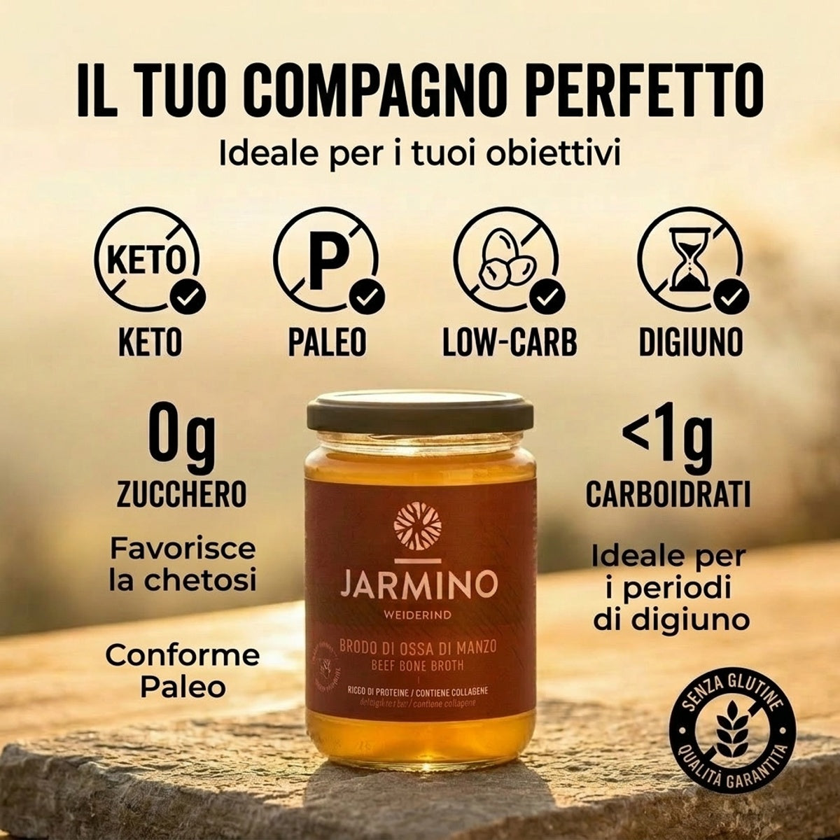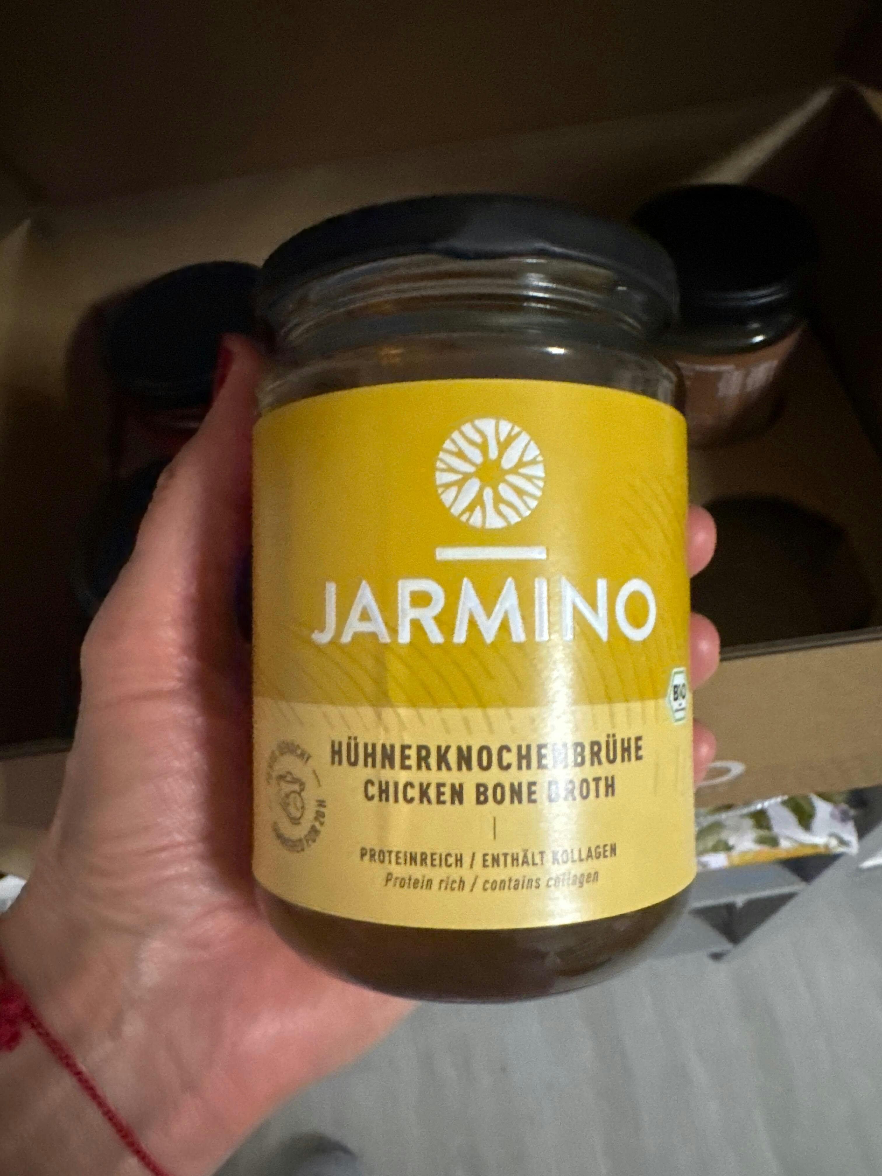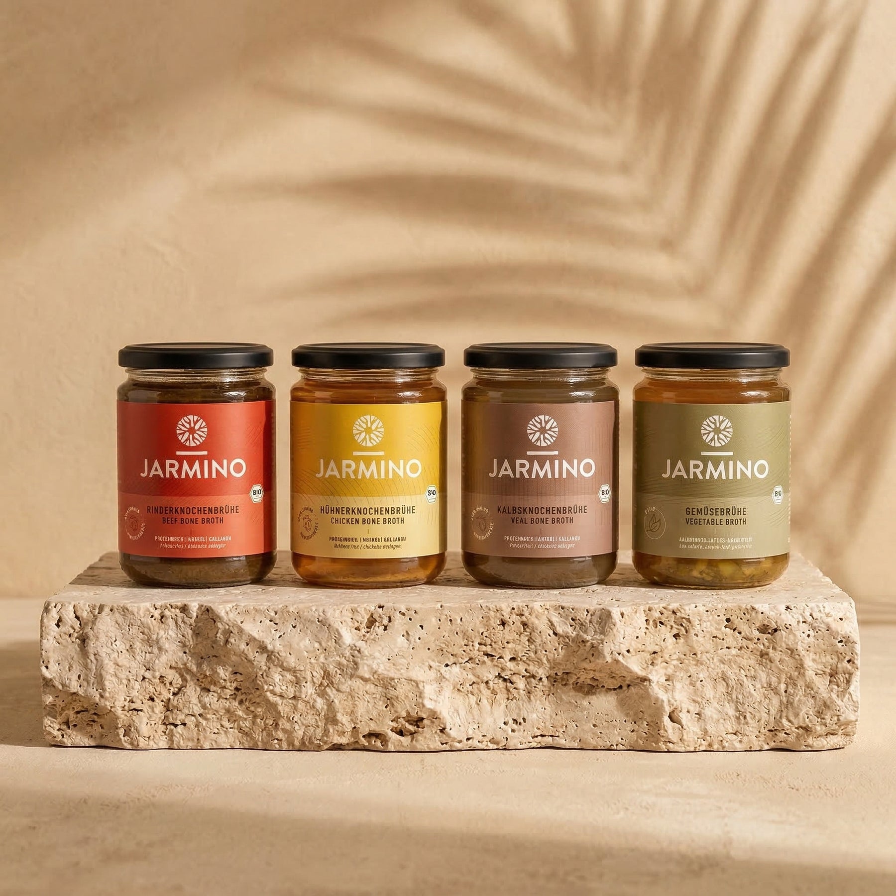 I brodi di ossa JARMINO cuociono a fuoco lento per 20 ore e contengono pertanto molti nutrienti preziosi come proteine, collagene, aminoacidi, glicosaminoglicani, minerali e vitamine. Sempre più persone attente alla salute consumano quotidianamente il nostro brodo di ossa o il nostro brodo vegetale o lo usano durante il digiuno o per cucinare. Gli ingredienti sono tutti biologici e provengono da 12 fattorie biologiche della Baviera e del Tirolo.